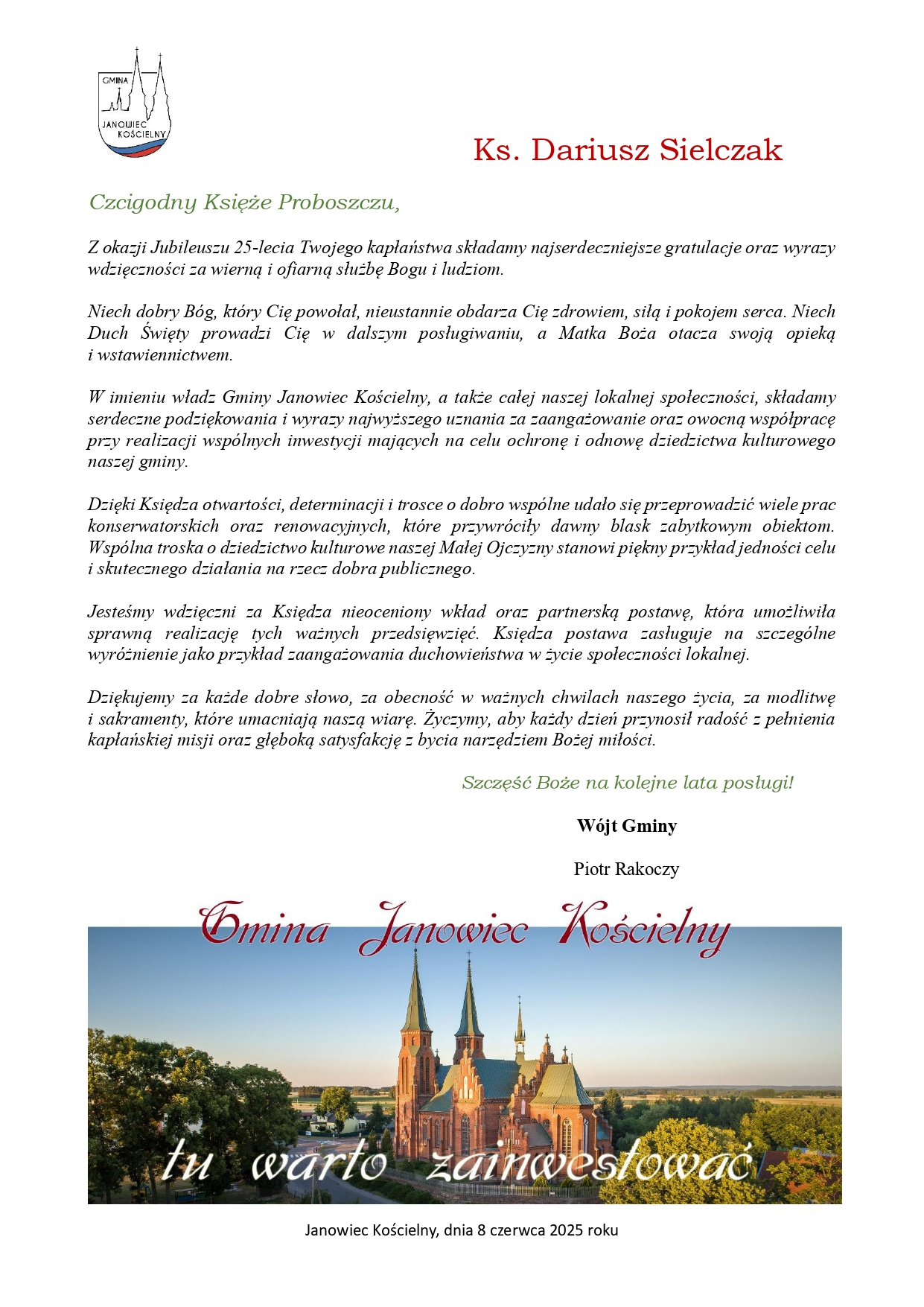 W minioną niedzielę (8.06.2025 r.) Parafia pw. św. Jana Chrzciciela w Janowcu Kościelnym stała się miejscem wyjątkowego wydarzenia – Jubileuszu 25-lecia kapłaństwa księdza proboszcza Dariusza Sielczaka. Z tej okazji parafianie przygotowali niecodzienne święto – rodzinny piknik przed kościołem, który zgromadził wiernych, sąsiadów i przyjaciół jubilata.
