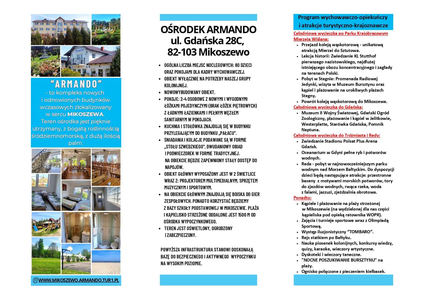 Kompleks ARMANDO to odnowione i nowe budynki w sercu Mikoszewa. Teren ośrodka jest pięknie utrzymany z bogatą roślinnością śródziemnomorską, z palmiarnią. To miejsce do wypoczynku na wysokim poziomie. Podczas pobytu będziemy wypoczywać, aż na trzech plażach: w Jantarze, Mikoszewie i Stegnie.